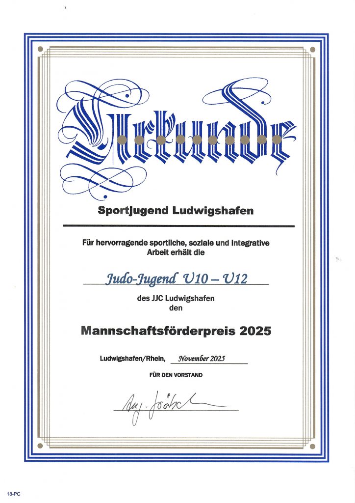 Mannschaftsförderpreis 2025 Veröffentlicht am 17. Dezember 202517. Dezember 2025 von Ralph Von der Sportjugend Ludwigshafen hat unsere Judo-Jugend U10-U12 den Mannschaftsförderpreis 2025 erhalten.